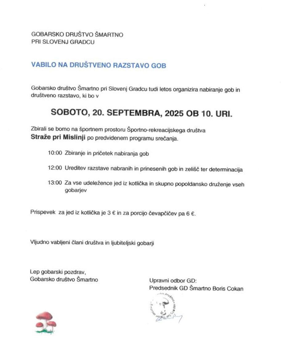 Gobarsko društvo Šmarno pri Slovenj Gradcu vabi na društveno razstavo gob