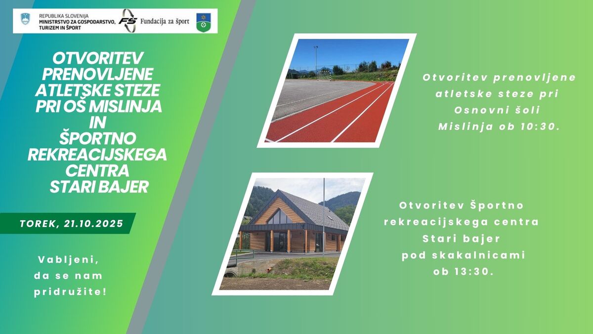Otvoritev prenovljene atletske steze pri OŠ Mislinja ob 10:30. Prenovljena steza bo otrokom naše osnovne šole omogočila še boljše pogoje za šport in gibanje – pridite in podprite našo mlado športno generacijo!
