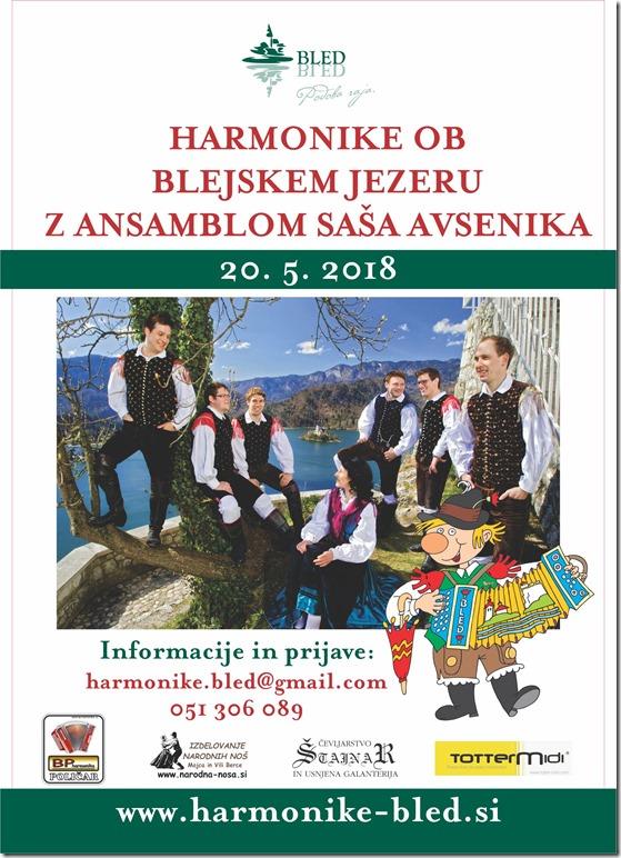 20. maja bo na Bledu ponovno pravi harmonikarski praznik. Lani je kar 533 udeležencev s harmonikami ob obali Blejskega jezera naenkrat zaigralo Avsenikovo skladbo Otoček sredi jezera. Letos boste udeleženci zaigrali skupaj s Sašom Avsenikom. Najprej ob 12. uri razporejeni ob obali Blejskega jezera skladbo Otoček sredi jezera, nato pa na zelenici pod odrom še Na Golici (uglasitve CFB) in Čebelarja (Be-es-as). Že tradicionalno bo ob 14. uri povorka harmonik z Majči Bobnar na Jezerski promenadi. Pravočasno prijavljeni (do 14. maja) bodo ponovno prejeli bon za malico, Unionovo pijačo in spominsko nalepko ter sodelovali v žrebanju za bogate nagrade naših pokroviteljev, kot so: Harmonika Poličar, bon v vrednosti 555 eur za nakup Totter midi sistema, darilni bon za izdelavo lajbča gorenjske narodne noše po meri izžrebanca iz rok Marije Mojce Berce iz Selc, darilni bon čevljarstva Štajnar iz Škofljice za izdelavo škornjev za narodno nošo po meri izžrebanca, vikend paket v hotelih Lovec – Kompas na Bledu, kosila v Restavraciji Labod in številne druge nagrade. Z Blejskim sirom bomo obdarili najštevilčnejšo vnaprej prijavljeno organizirano skupino harmonikarjev, razglasili najmlajšega in najstarejšega udeleženca…