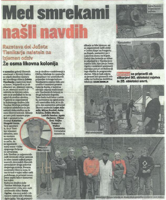Ob 90. letnici rojstva in 20. letnici smrti našega rojaka, slikarja Jožeta Tisnikarja je Kulturno društvo Jože Tisnikar iz Mislinje pripravilo že tradicionalno likovno kolonijo, ki so jo izvedli na Kopah. Odziv umetnikov je bil velik, za pokušino pa vam posredujemo članek, ki je bil odjavljen v dnevniku Slovenske novice.