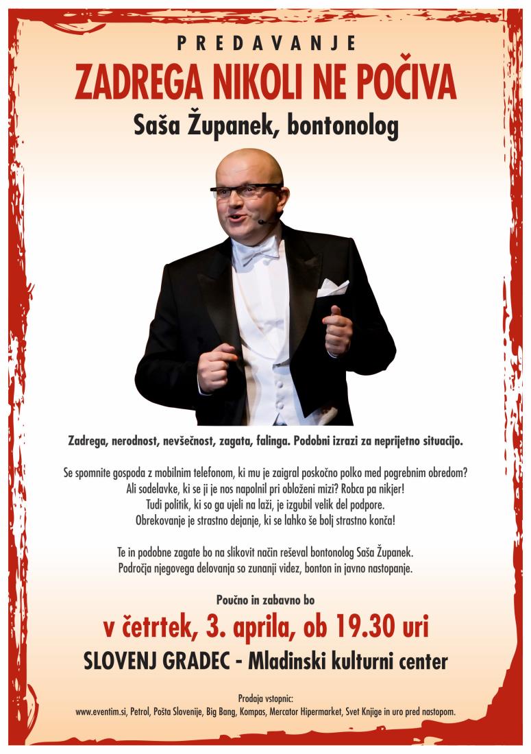 V četrtek, dne 3. aprila 2014, ob 19.30 uri, v mladinskem kulturnem centru v Slovenj Gradcu, bo imel predavanje z naslovom »Zadrega nikoli ne počiva« bontonolog Saša Županek.