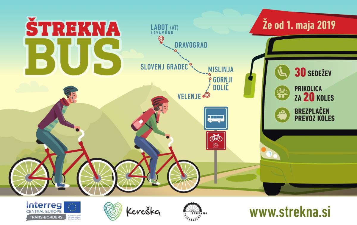 Štrekna bus bo tridesetsedežni avtobus s prikolico za dvajset koles. Vozil bo na relaciji med Velenjem, Gornjim Doličem, Mislinjo, Slovenj Gradcem, Otiškim Vrhom, Dravogradom ter kopalnim jezerom v Labotu (Lavamünd) na avstrijski strani. V poletnih mesecih, juliju in avgustu, bo vozil dvakrat dnevno vsak dan, v maju, juniju in septembru pa ob vikendih in praznikih – slovenskih in avstrijskih. Prve vožnje se obetajo že 1. in 2. ter 4. in 5. maja. Vozovnice bo možno kupiti na avtobusu ali avtobusnih postajah v Velenju in Slovenj Gradcu. Cene so določene kot cene medkrajevnega avtobusnega prometa v Sloveniji, prevoz kolesa pa bo brezplačen; na primer vožnja za eno osebo med Velenjem in Dravogradom bo stala 4,7 evra, do Labota v Avstriji pa še dodatna 2 evra. Med Velenjem in Dravogradom bo avtobus lahko obstal na vseh obstoječih avtobusnih postajališčih, za kolesarje pa priporočamo uporabo avtobusnih postajališč Velenje, Gornji Dolič, Mislinja, Slovenj Gradec, Šentjanž, Otiški vrh, Dravograd, Labot/Lavamünd in Labot/Lavamünd kopalno jezero. Vožnja med Velenjem in Labotom/Lavamündom traja 1 uro in 20 minut. Celoten vozni red je dostopen na spletni povezavi http://strekna.si/strekna-bus-vozni-red.jpg.