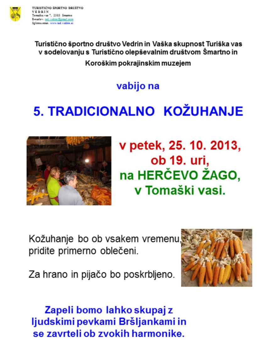 Turistično športno društvo Vedrin in Vaška skupnost Turiška vas v sodelovanju s Turistično olepševalnim društvom Šmartno in Koroškim pokrajinskim muzejemvabijo v petek, 25. oktobra 2013, ob 18. uri na 5. tradicionalno kožuhanje na Herčevi žagi v Tomaški vasi. Zapeli bomo s pomočjo ljudskih pevk Bršljank, poskrbljeno pa bo tudi za jedačo in pijačo.