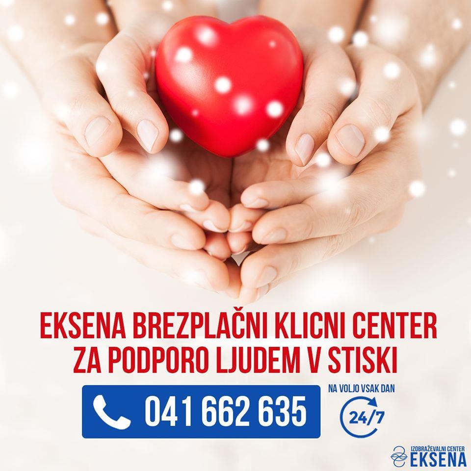 V trenutni izredni situaciji koronavirusa v Sloveniji je za vse, ki bi se znašli v stiski in bi potrebovali podporo, na voljo EKSENA BREZPLAČNI KLICNI CENTER ZA POMOČ LJUDEM V STISKI.
