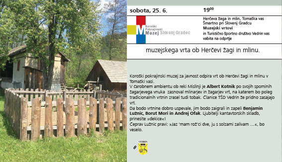 Koroški pokrajinski muzej, Muzej Slovenj Gradec in Turistično športno društvo Vedrin vas v soboto, 25. junija 2016, ob 19.00 vabita na Herčevo žago in mlin, Tomaška vas, Šmartno pri Slovenj Gradcu na odprtje muzejskega vrta ob Herčevi žagi in mlinu.