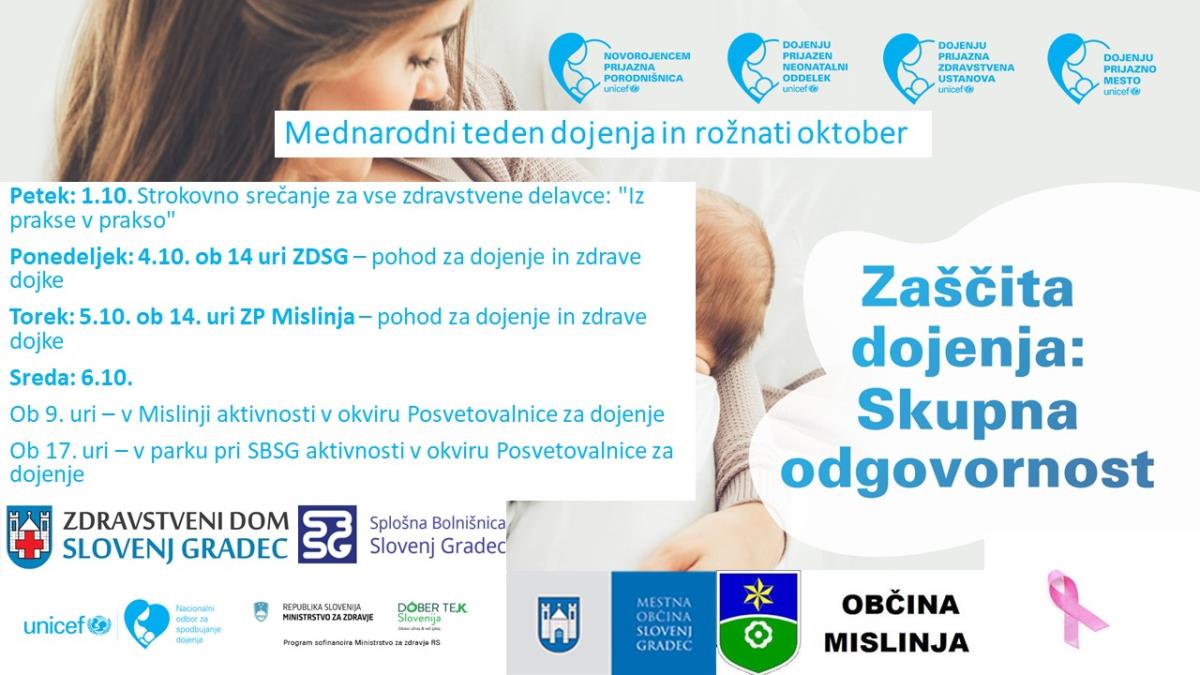 Ob tem mednarodnem tednu dojenja in v okviru rožnatega oktobra, bomo v Zdravstvenem domu Slovenj Gradec v sodelovanju s Splošno bolnišnico Slovenj Gradec in tamkajšnjo porodnišnico in pediatričnim oddelkom ter MO Slovenj Gradec in občino Mislinja pripravili nekaj aktivnosti: