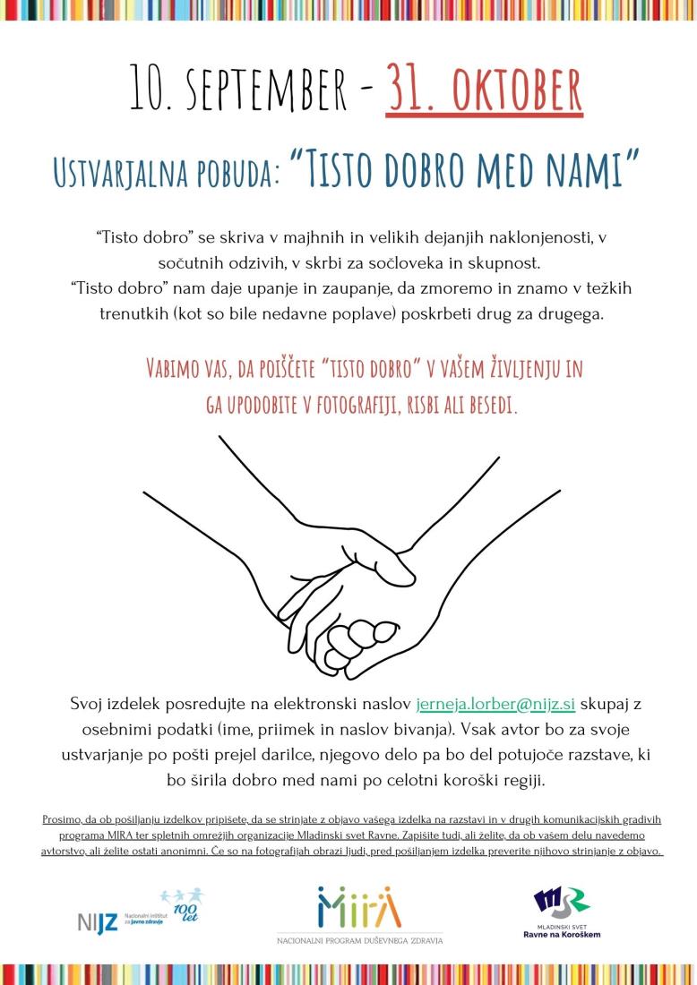 Pod okriljem Programa MIRA se bodo v naslednjih dneh v okviru obeležitve Svetovnega dne duševnega zdravja na devetih območnih enotah NIJZ odvijale različne dejavnosti, srečanja, predavanja, delavnice, pogovori, razstave in druge aktivnosti, namenjene ozaveščanju ljudi o pomembnosti skrbi za duševno zdravje, širitvi znanj o tem, kako krepiti duševno zdravje, destigmatizaciji duševnih stisk, motenj in bolezni. Podrobnosti o dogodkih se nahajajo na spletni strani Programa Mira.